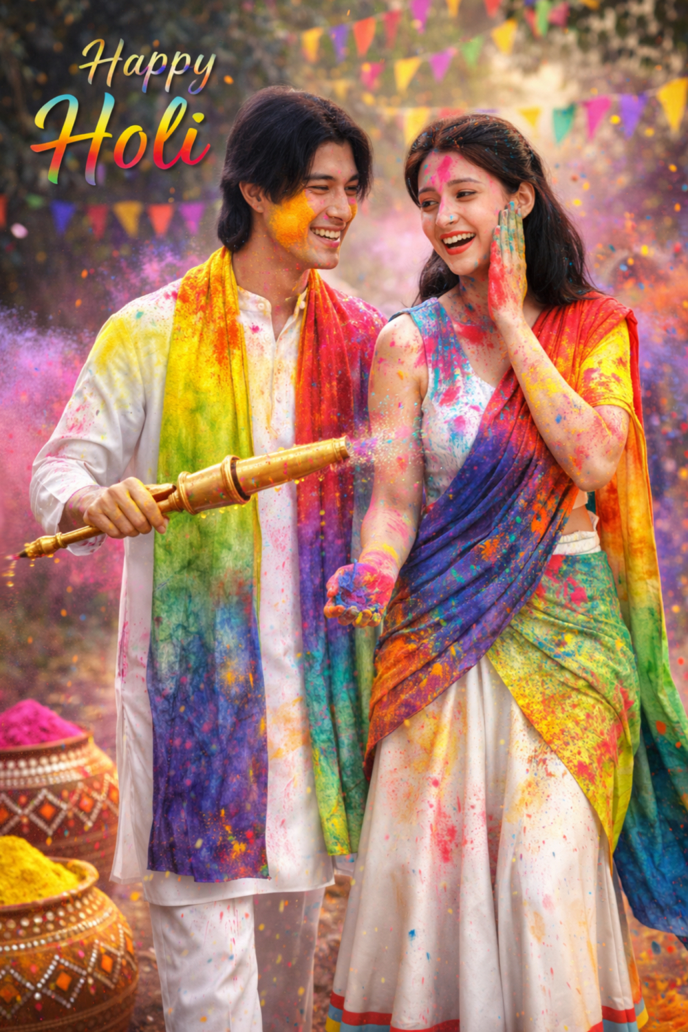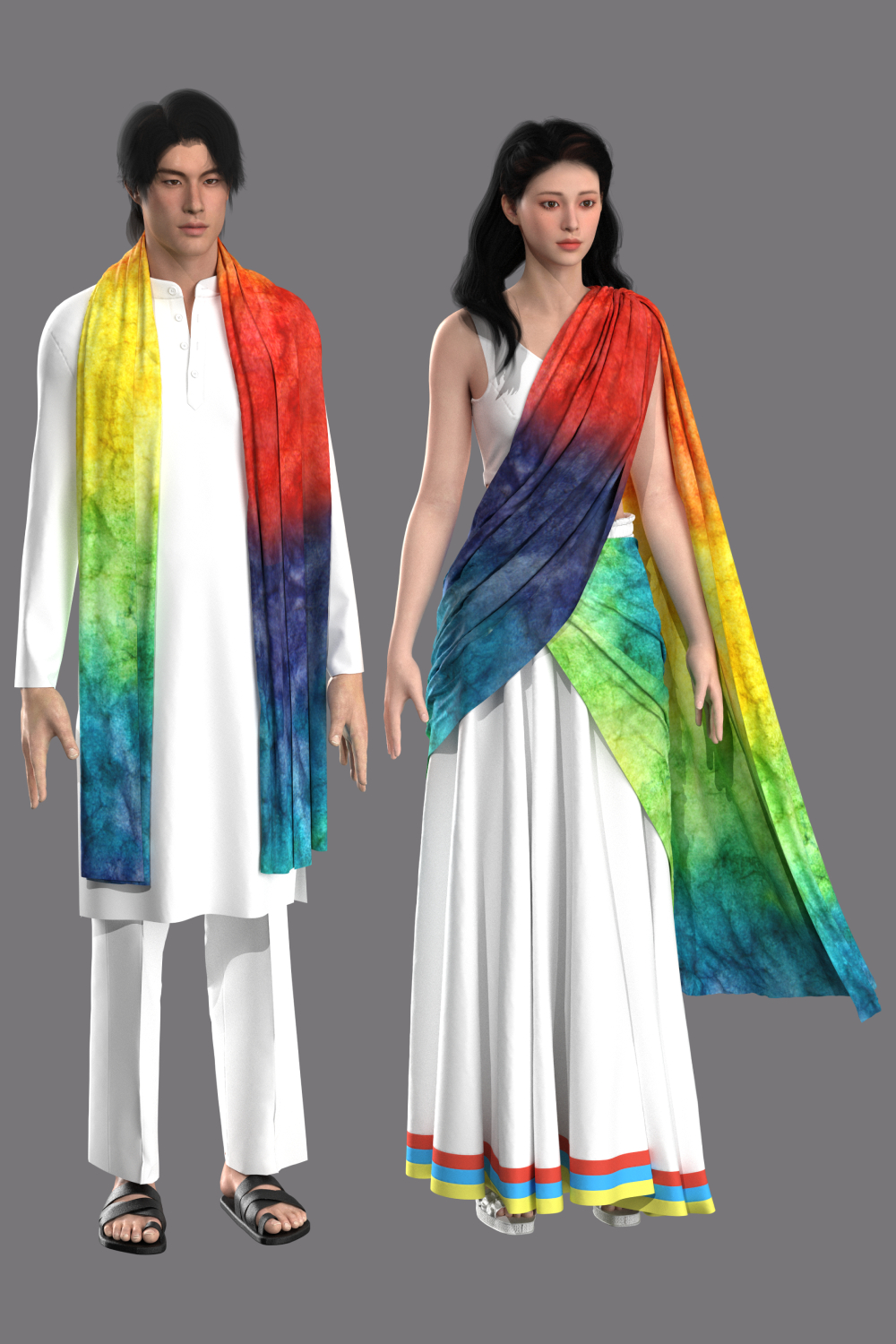 Designed ethnic garments in CLO3D with emphasis on fluid drapes, vibrant colors, and natural garment movement. The final visual was enhanced using AI to create a lively Holi celebration scene, capturing joy, energy, and festive spirit while expressing colors and emotions through storytelling.