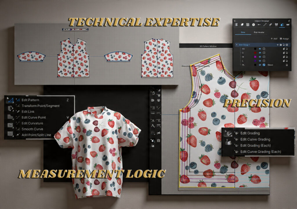 I develop precise digital patterns based on garment design, measurements, and industry standards. Patterns are created with production logic to ensure accurate fit and scalability across sizes.